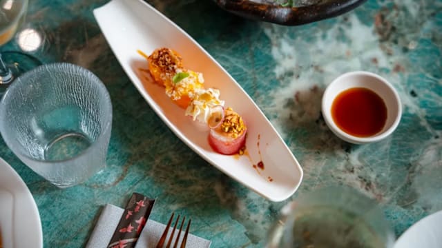 Rotolo di riso e alga, con tempura di gamberi e avocado guarnito di scampi, salsa mango, teriyaki e crunch di kataifi
