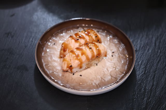 - Salmón, tempura, kataifi, salsa teriyaki