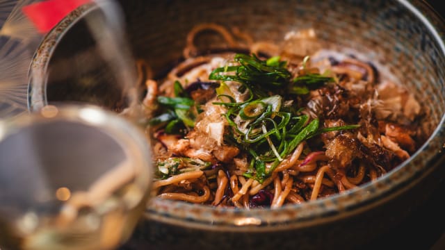 Massa de trigo salteada com camarão, legumes do dia e miso shiru