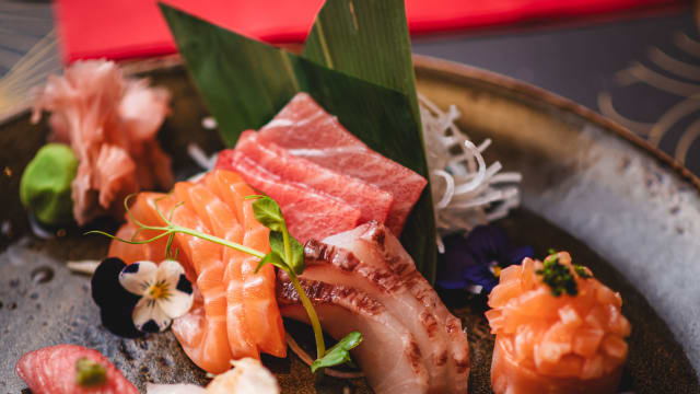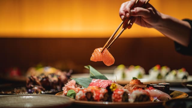Salmão, doce de maça, camarão em tempura, canela e ikura