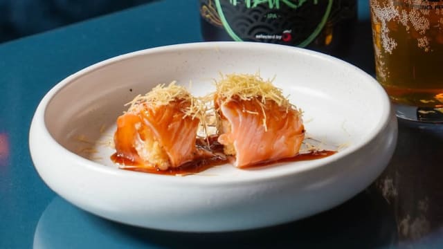- Bocconcino di riso, avvolto da alga nori, salmone, salsa matsu e miso dolce