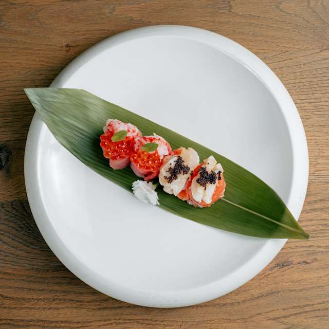 - Gambero in tempura, tartare di salmone, carpaccio di salmone scottato, maionese piccante e teriyaki