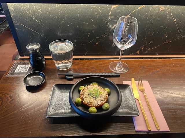 - Atún rojo bluephin, aguacate, cobertura de atún, crema tartufata, teriyaki y sésamo.