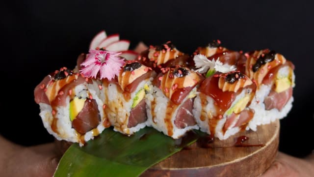 Relleno de salmón y queso crema, ikura de salmón, masago arare y cremoso de aguacate. (8 uds)