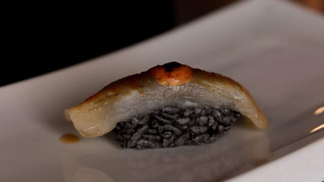 Arroz de sushi, Vieira, foie, dressing de sésamo, braseado con salsa mayo japo, salsa unagi y furikake de huevo. (1 UD)