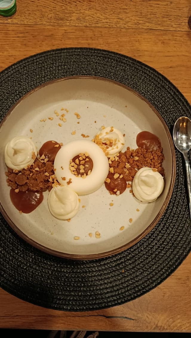 Crumble al caramello, mousse vaniglia e noci pecan, praline di arachidi