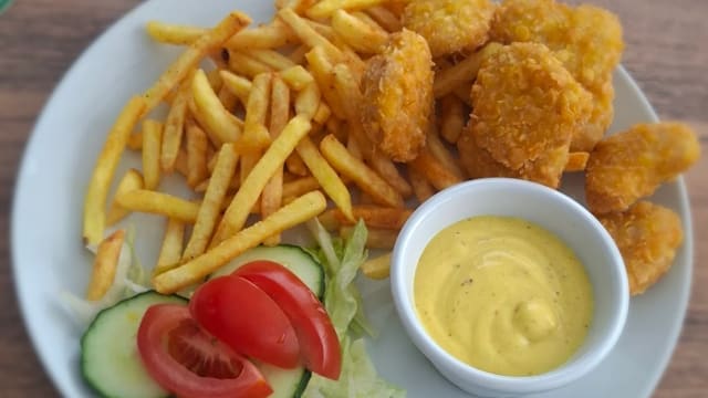 Fried fish fingers, french fries, salad, our homemade remoulade sauce and a slice of lemon