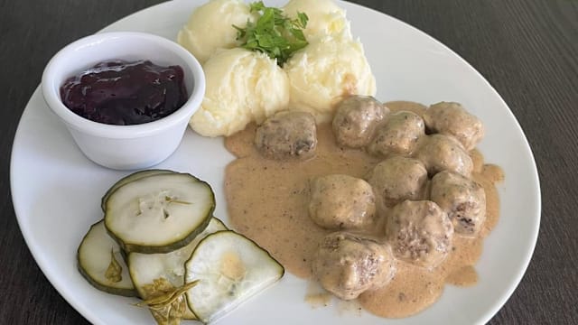 Meatballs on mixed meat with homemade mashed potatoes, creamy sauce, lingonberries, and pickled cucumber