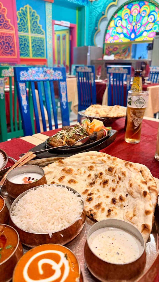 - Tres diferentes pratos de carnes com arroz, pão e raita