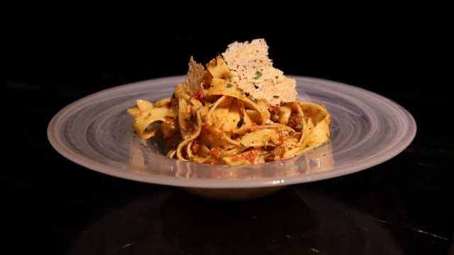 - Paccheri al huevo con crema de n’duja y vino tinto