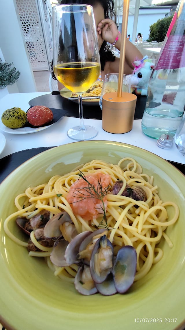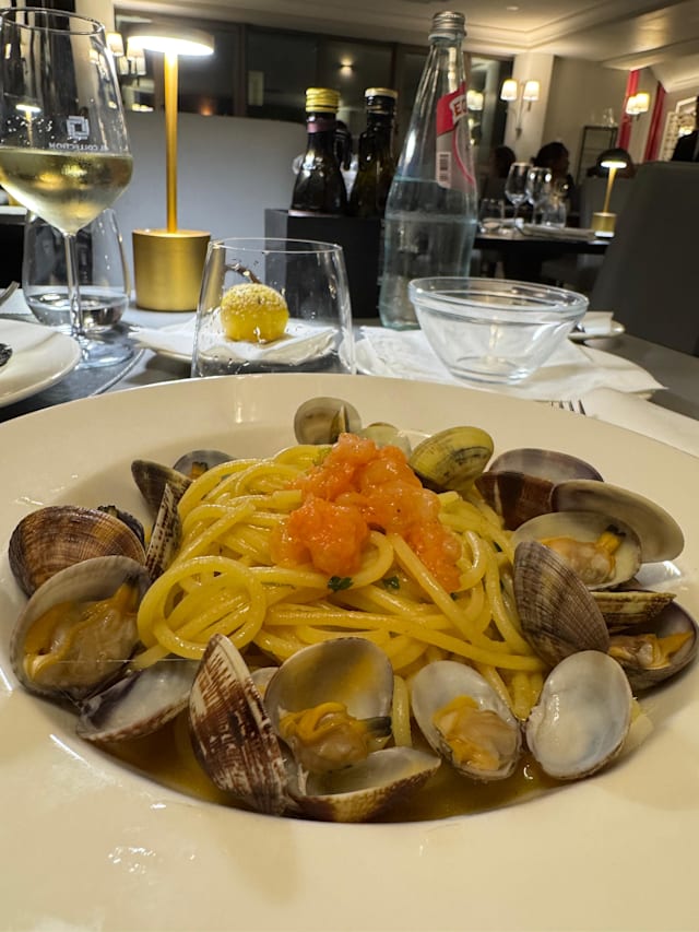 Spaghettone alle vongole con lime e crudités di gambero rosso
