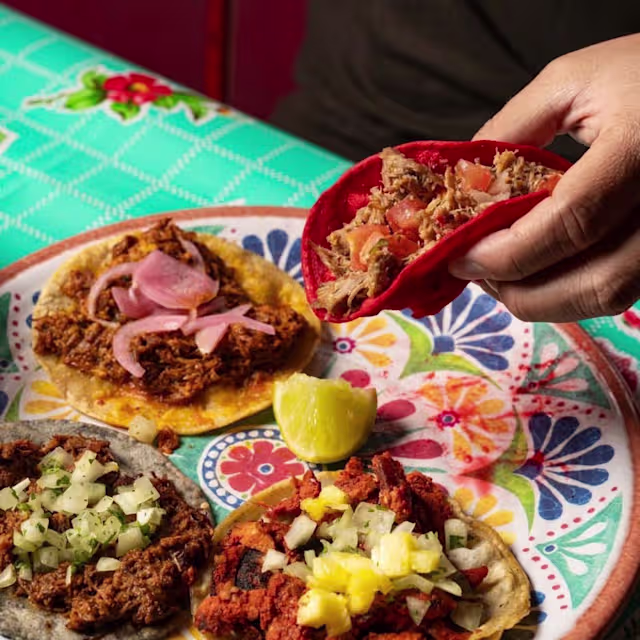 - Un taco con tortilla de maíz, el relleno que quieras, salsa verde, cebolla y cilantro.