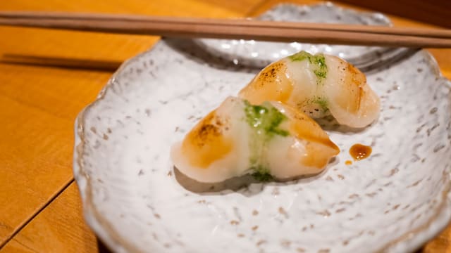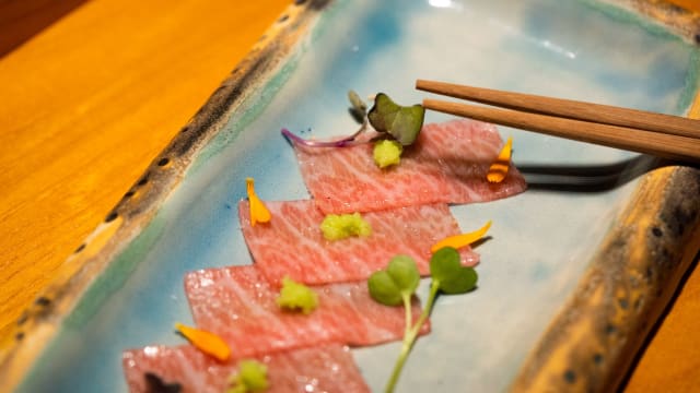 Ternera japonesa a la robata con wasabi fresco y chips de ajo