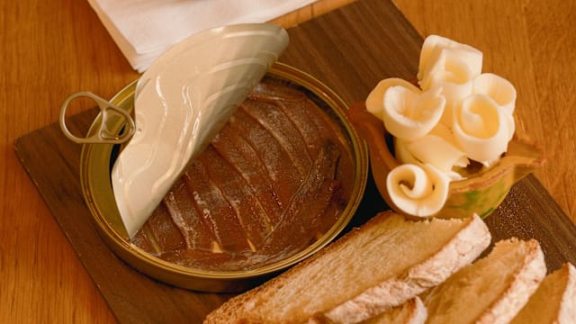 Latta di acciughe del mar cantabrico”, selezionate e sfilettate a mano,servite con crostini e burro. Non le solite acciughe.