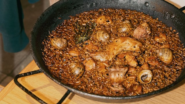 Paella di carne di coniglio e lumache di terra infuse al rosmarino