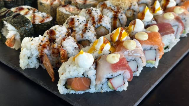 Surimi in tempura, avocado, insalata di surimi, tobiko e teriyaki