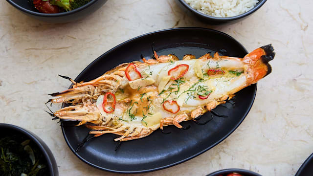 Camarão tigre com arroz branco
