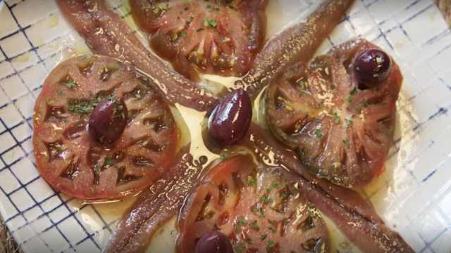 - Base de tomate con anchoas OO, aceitunas kumata y aceite de oliva virgen extra.