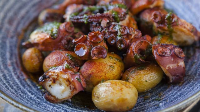 Pata de pulpo de roca en robata y patatas revolconas con pimentón de la vera
