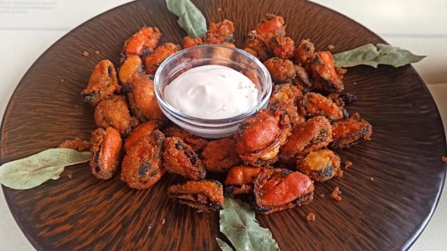 En escabeche casero y rebozados, sin concha, con salsa de mahonesa y escabeche en cuenco por separado