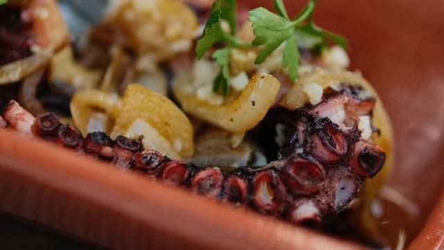 Polvo cozido em cama de cebola e pimentos, batata e amêijoas