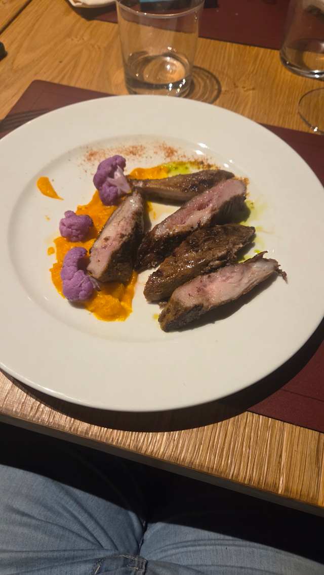 - Taglio di carne pregiato ricavato da mailai di pura razza iberica, servito con purè di carote e cavolfiore arrosto, guarnita con olio aromatizzato basilico e porro.