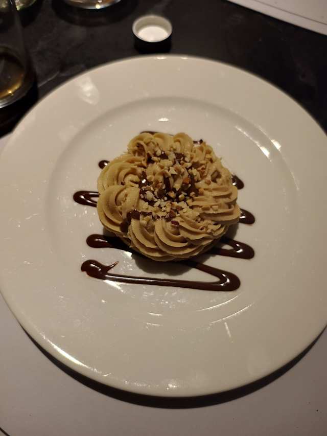 - Coda di filetto su fonduta di grana padano, fondo bruno, funghi porcini trifolati e cialda di cacio e pepe. Guarnito con olio aromatizzato basilico e porro.