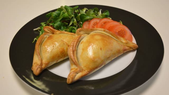 En valfri empanada; kött/ost/feta & spenat serveras med chilensk pebre (tomat, chili, koriander och lime)
