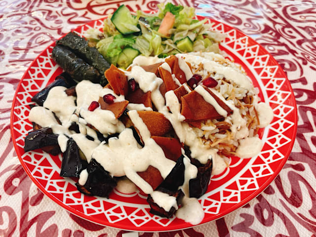 Aubergines marinées nappées de sauce secrète au tahini et yaourt, servies avec du riz et une salade et feuilles de vigne
