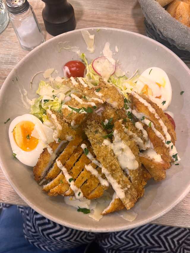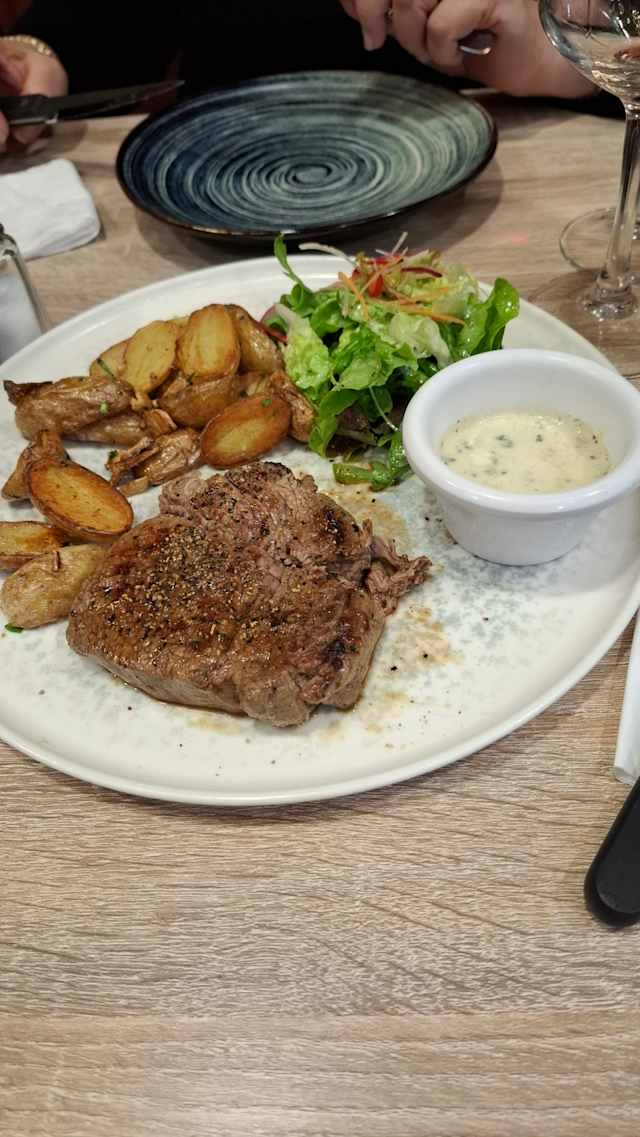 8.5/10Excellent friendly service. We ordered the Filet de Boeuf and the Chicken Ceaser Salad and both were good. The ambiance is casual; we ate calmly and chatted over drinks and never felt rushed.