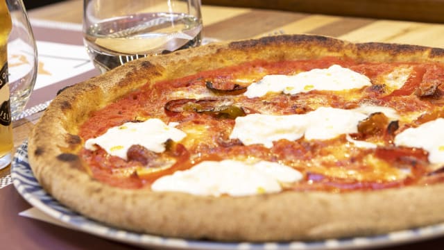 Mozzarella fior di latte, gorgonzola, caciocavallo silano, chips di parmigiano, spianata calabrese, miele
