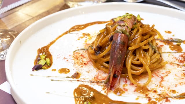 Paccheri, gambero rosso, datterini, burrata e arachidi tostate