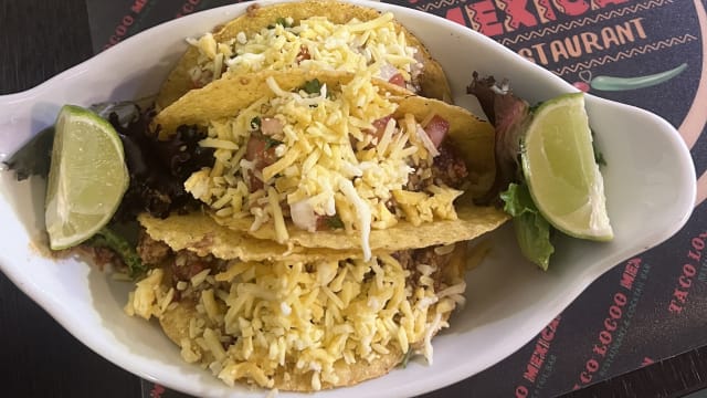 Grande tortilha de trigo frita com o seu recheio favorito, puré de feljão, queljo mexicano e pico de gallo servido com guacamole, natas, arroz mexicano, jalapeños e salada fiesta