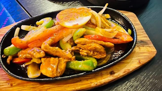 Tiras grelhadas à sua escolha em cama de pimentos suaves e cebola servidas a escaldar com acompanhamento de guacamole, creme de leite, puré de feijão, pico de callo e tortillas quentes