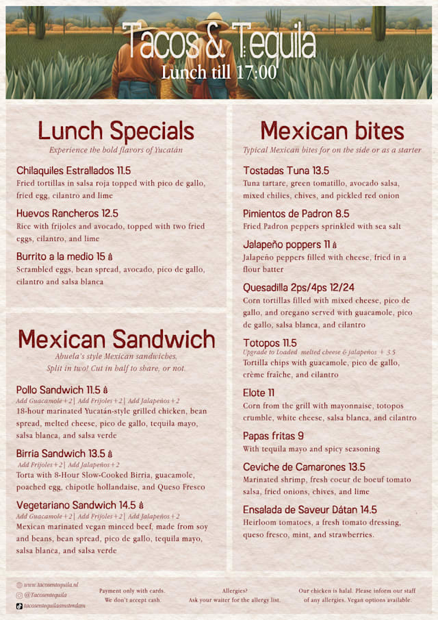 10/10A Mexican friend of mine recommended I eat at Taco's & Tequila, and it didn't disappoint! The food was genuine Mexican cuisine and delicious; it was also possible to enjoy Mexican beers, as well as great cocktails. The staff is friendly and the atmosphere is cosy. The location is super convenient if you have a concert at Melkweg or Paradiso. The total experience was great! I recommend.