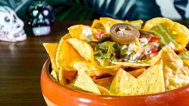 Totopos, guacamole, chili con carne, queso amarillo, salsa agria y jalapeños.
