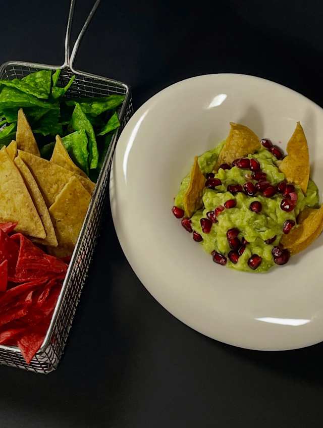 - Aguacate, zumo de lima, cebolla y cilantro, acompañado de totopos de maíz