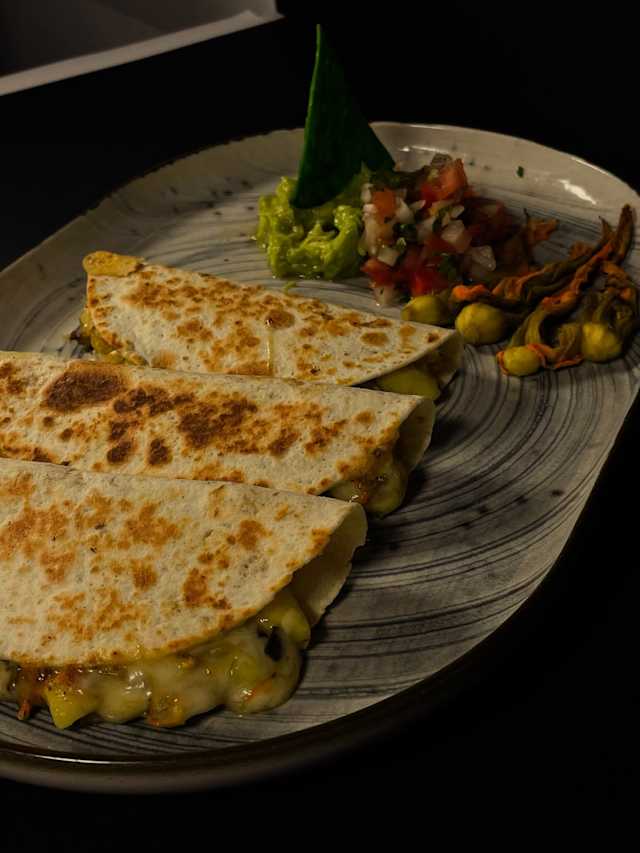 - Tortilla de trigo con queso fundido y un ingrediente a elegir: - jamón. - huitlacoche - pollo - birria - flor de - pastor calabaza