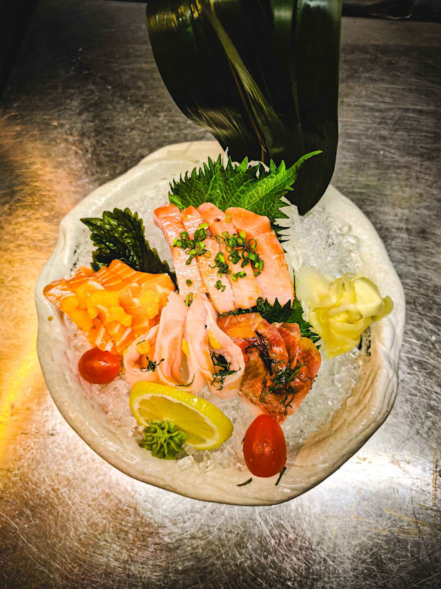 Sashimi saumon sauvage coho haut de gamme, thon rouge de Méditerranée sauvage et bar haut de gamme avec leur sauce faite maison.
