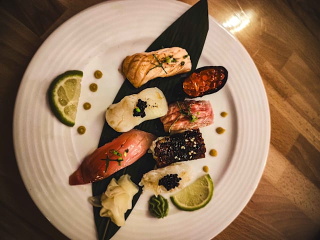 1 pièce de nigiri sushi "thon rouge" de thon rouge de Méditerranée sauvage haut de gamme, oursin haut de gamme d'Islande et caviar, contient wasabi frais assaisonné.