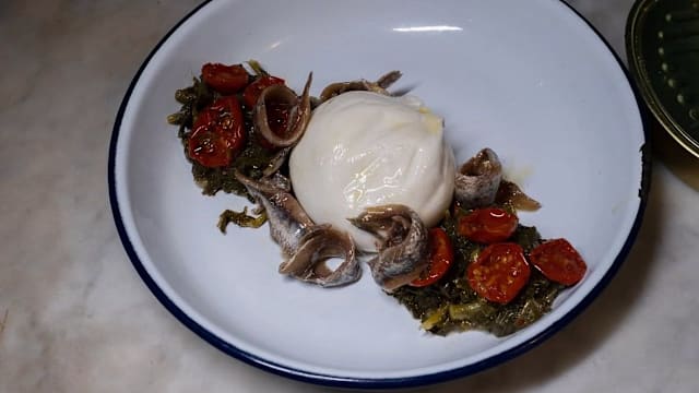 Burrata campana, acciughe liguri, friarielli saltati e pomodorini confit.