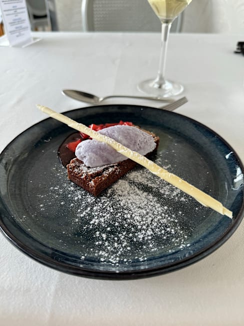 9/10Beautiful view upstairs. Really good service. The starter and main courses were good and lovely sparkling wine but the desert let the meal down for us - I got a very strange rice pudding flavoured with Port which just did not work, it wasn't sweet enough, my husband got "chocolate forest" which was like a big "wagon wheel" - we were disappointed with the deserts not too our taste!