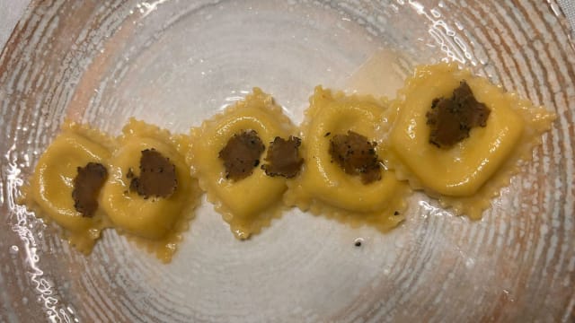 Ravioli ripieni di chianina, serviti con crema di spinaci, stracciata pugliese e mollica di pane fritto