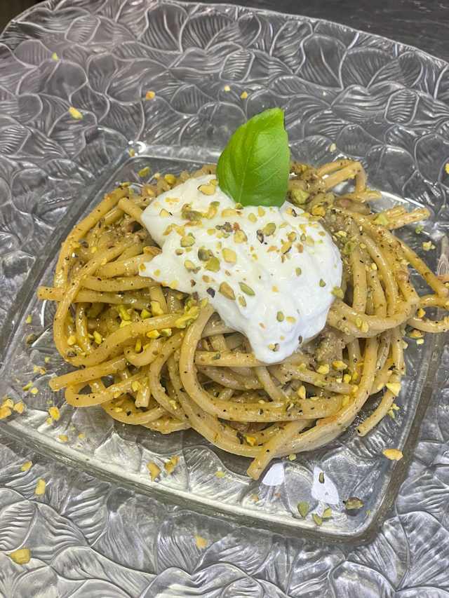 - “Pesto di pistacchio, burratina, salsiccia, granella di pistacchio e basilico”