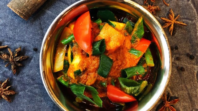 Een redelijk pittig gerecht van lamsvlees, gebakken uitjes, verse tomaten, verse pepers, verse chili & een verrassende kruidenmix (medium heet)