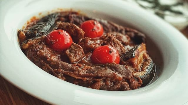 Khoresht bademjan, is a very stir-fried stew from persian meat. A wholesome stew with veal or sirloin, zucchini and eggplant is flavored with tomato sauce, onions. Served with tzatziki and topped with saffron rice.