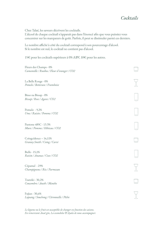 Talaé a choisi de proposer une véritable carte de cocktails en accord avec la cuisine du restaurant. Le tout dans une démarche raisonnée et zéro déchet.