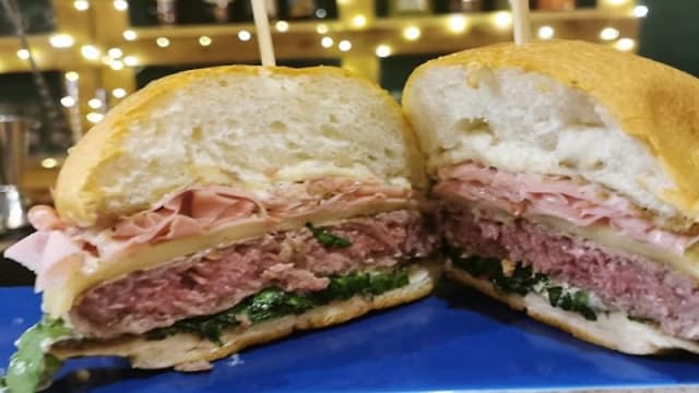 Bun artigianale con burger di manzo 180gr, doppio cheddar, anelli di cipolla, bacon croccante, uova all'occhio di bue, salsa barbecue al barbon