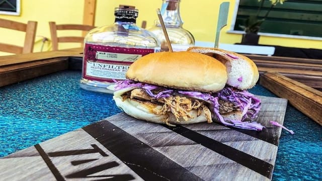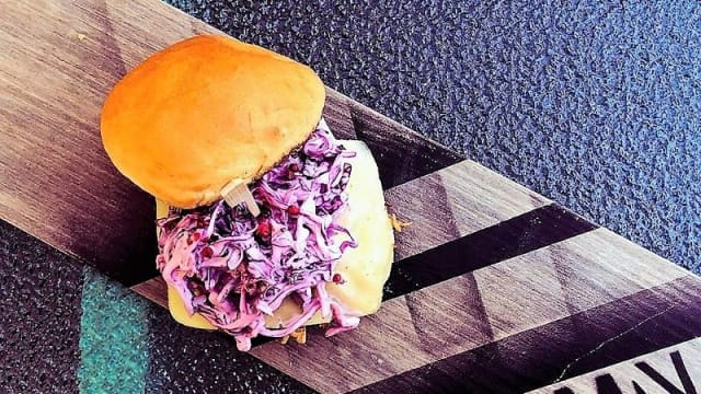 Bun artigianale con pulled chicken alla birra ipa e hammer con insalata al pepe rosa