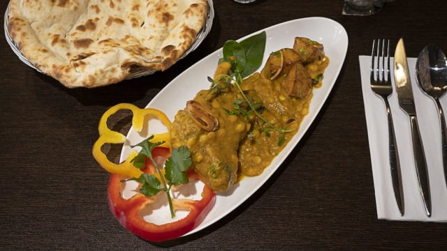 Kryddmarinerad och lerung grillad, serveras med färsk stekta grönsaker och tikka masalasås.